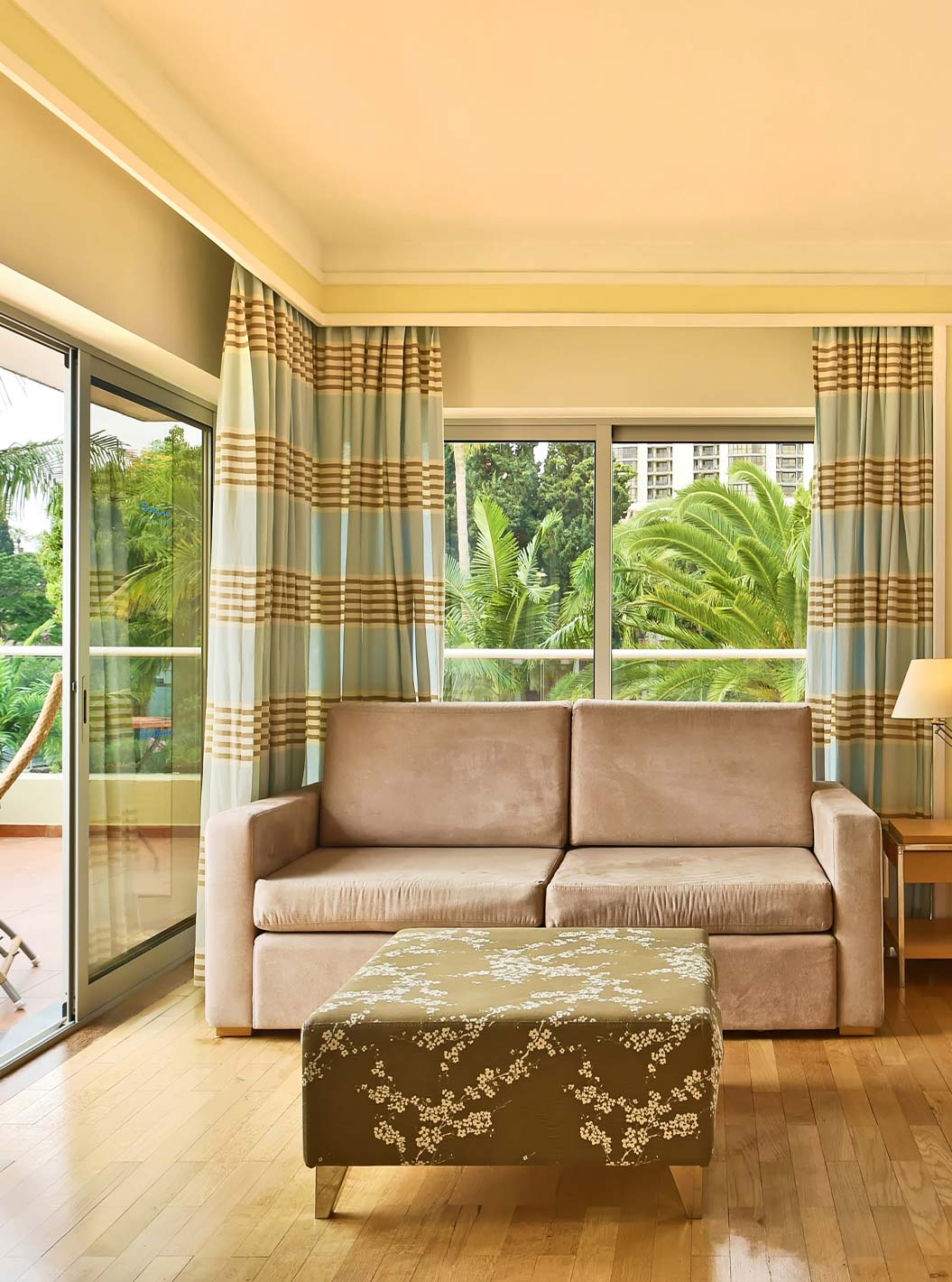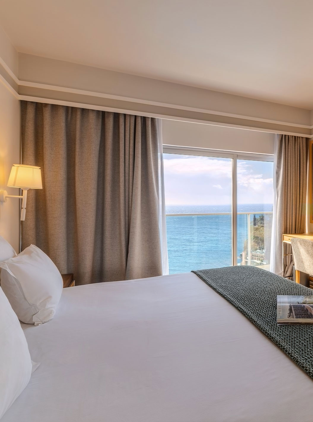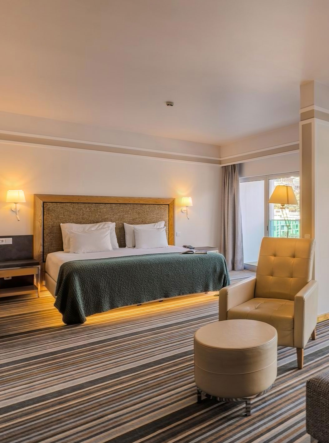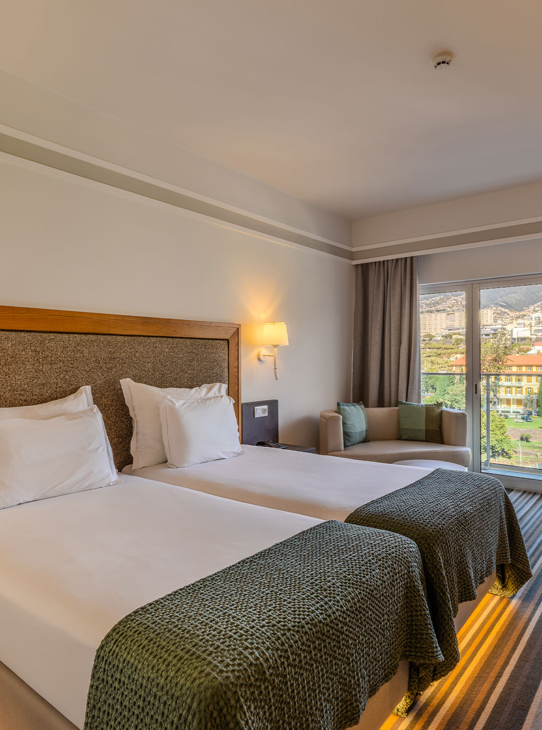 La Junior Suite del Pestana Carlton Madeira tiene cama de matrimonio con un banco al pie y un armario con espejos