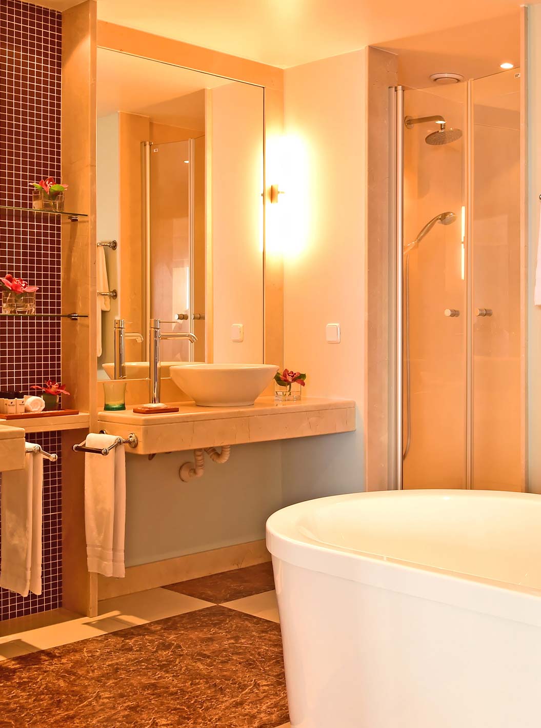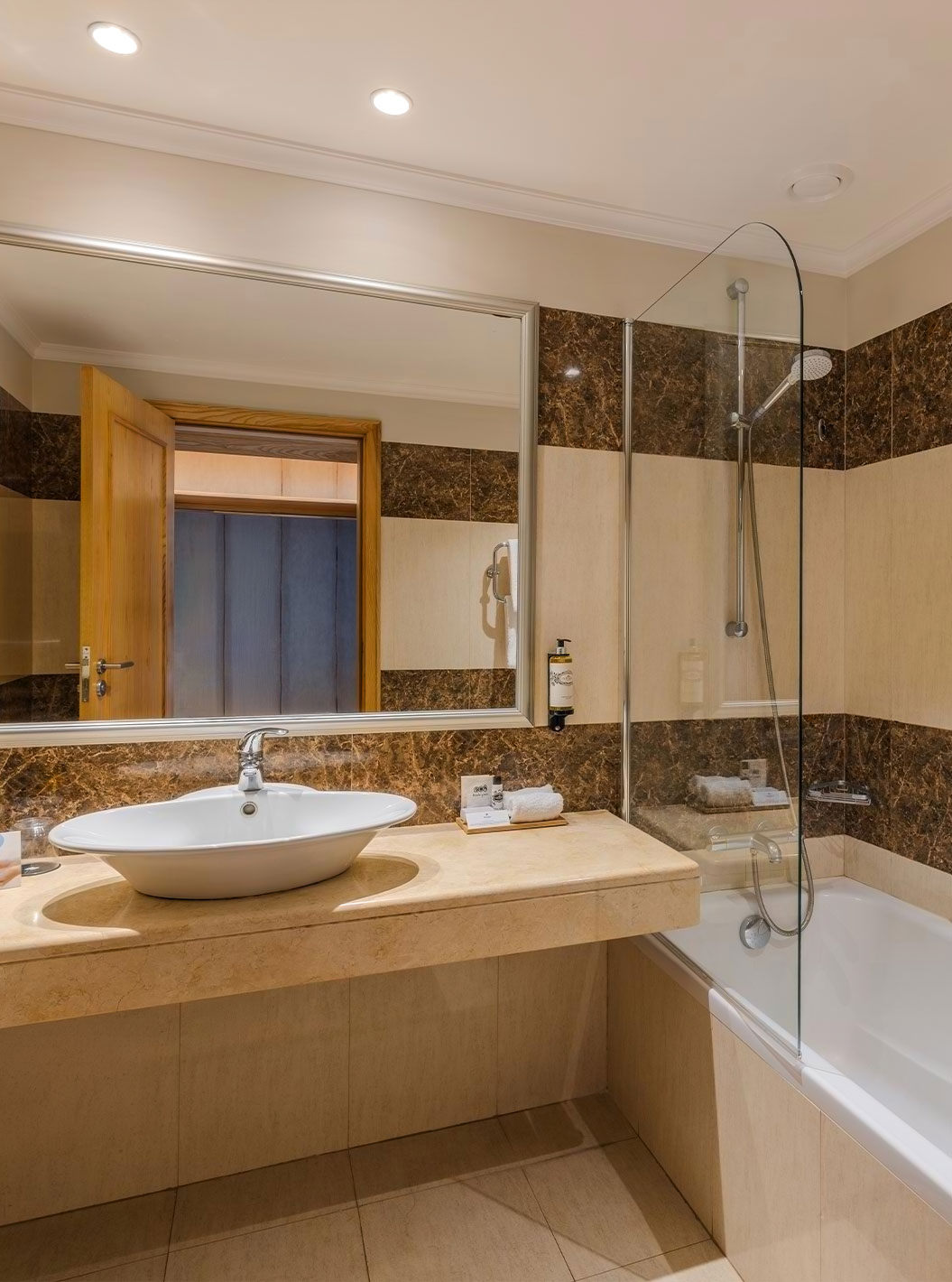 La habitación Doble Clásica Vista Piscina del Pestana Carlton Madeira tiene baño con azulejos marrones y bañera