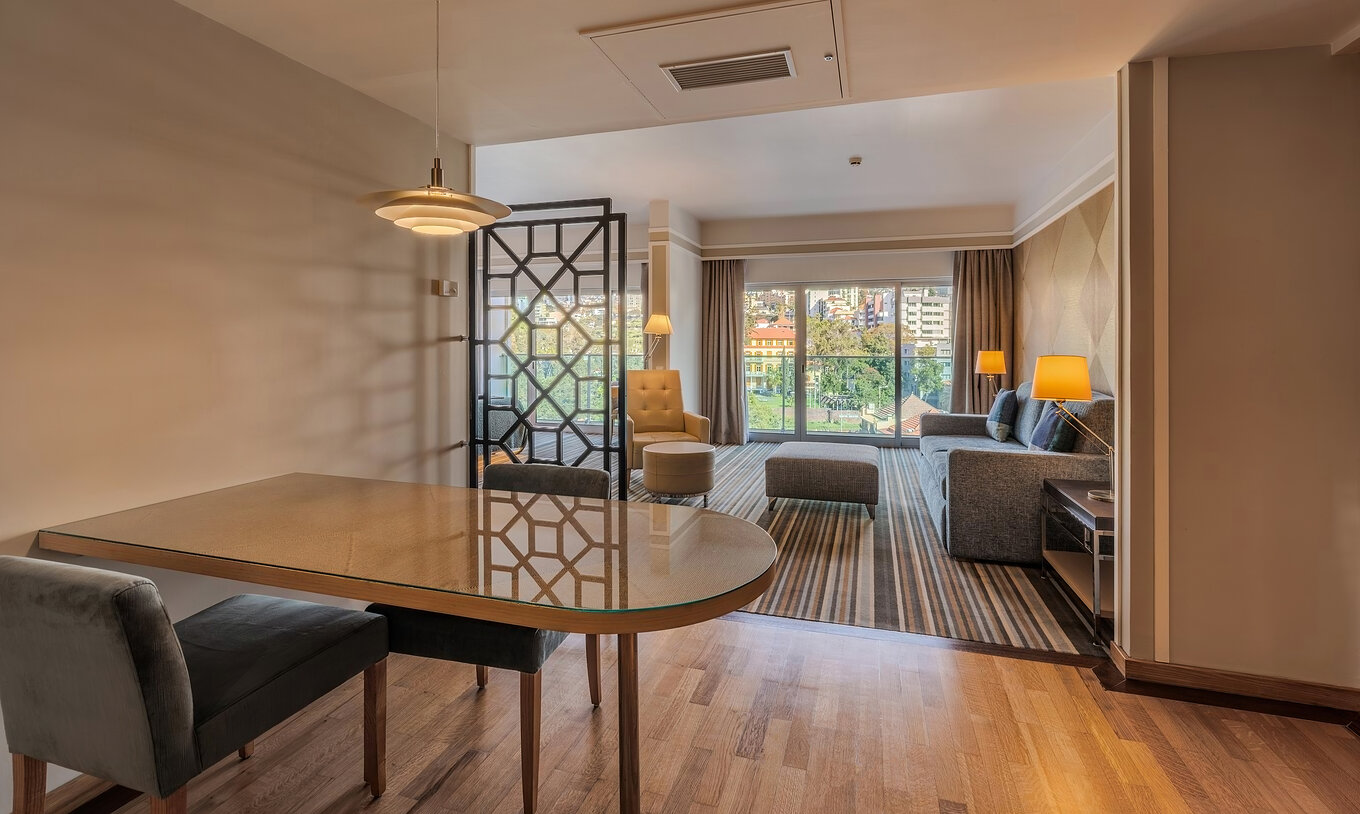 El Pestana Carlton Madeira, hotel en el Centro de Funchal frente al mar, tiene una sala de reuniones con mesa grande y sillas
