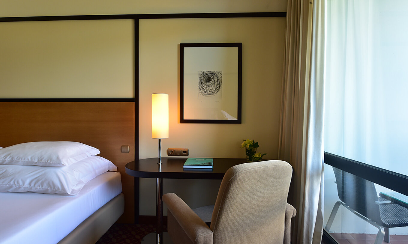 La Suite Vista Tierra del Pestana Casino Park tiene cama de matrimonio, escritorio con lámpara y balcón