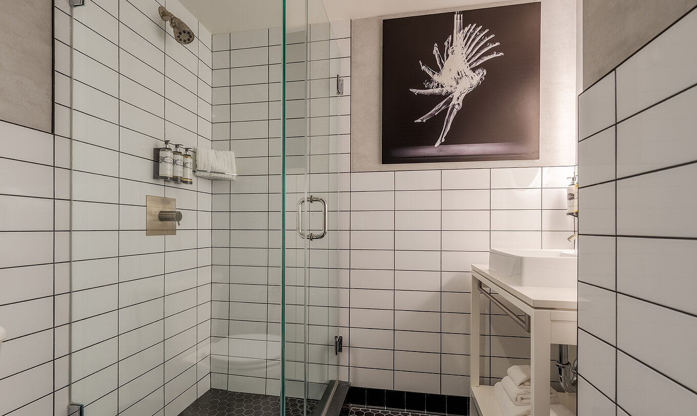 El Comfort Double del Pestana CR7 Times Square tiene un baño con ducha, lavabo y un espejo