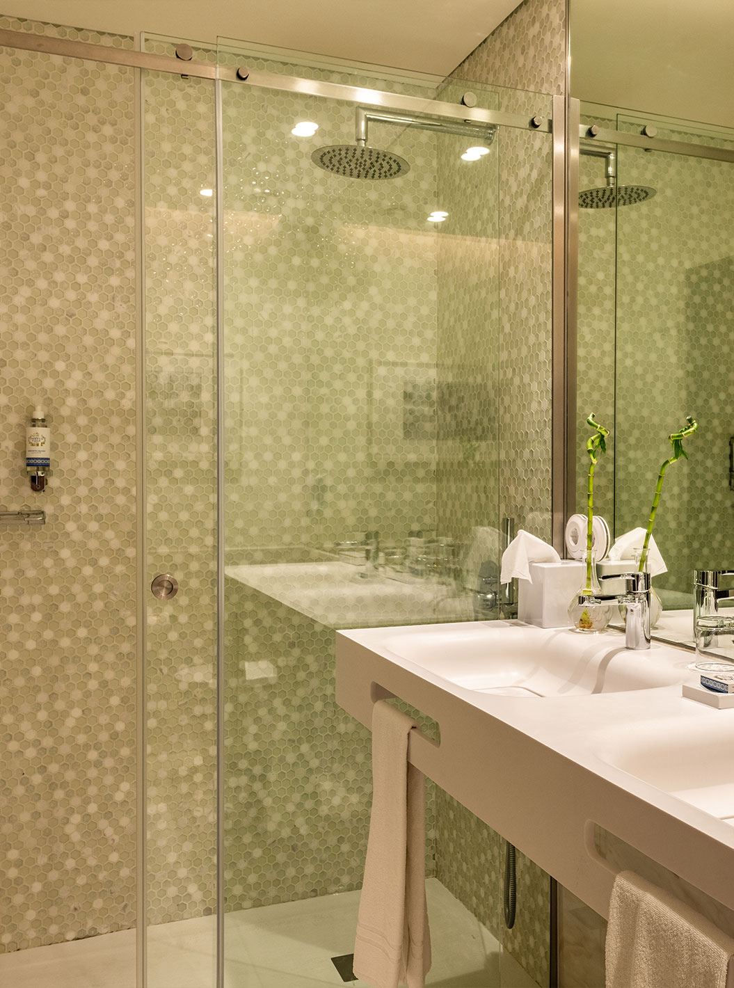 O Deluxe do Pestana Porto - A Brasileira tem uma casa de banho com decoração moderna, com lavatório, chuveiro e um espelho