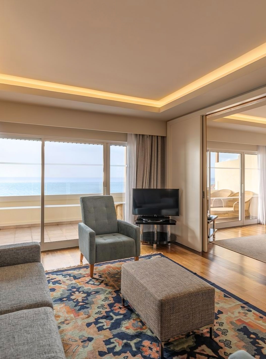 De ontspanningsruimtes nodigen je uit, net als de fitnessruimte, de massageruimte en het binnenzwembad, met tientallen ligstoelen en frontaal uitzicht op zee.