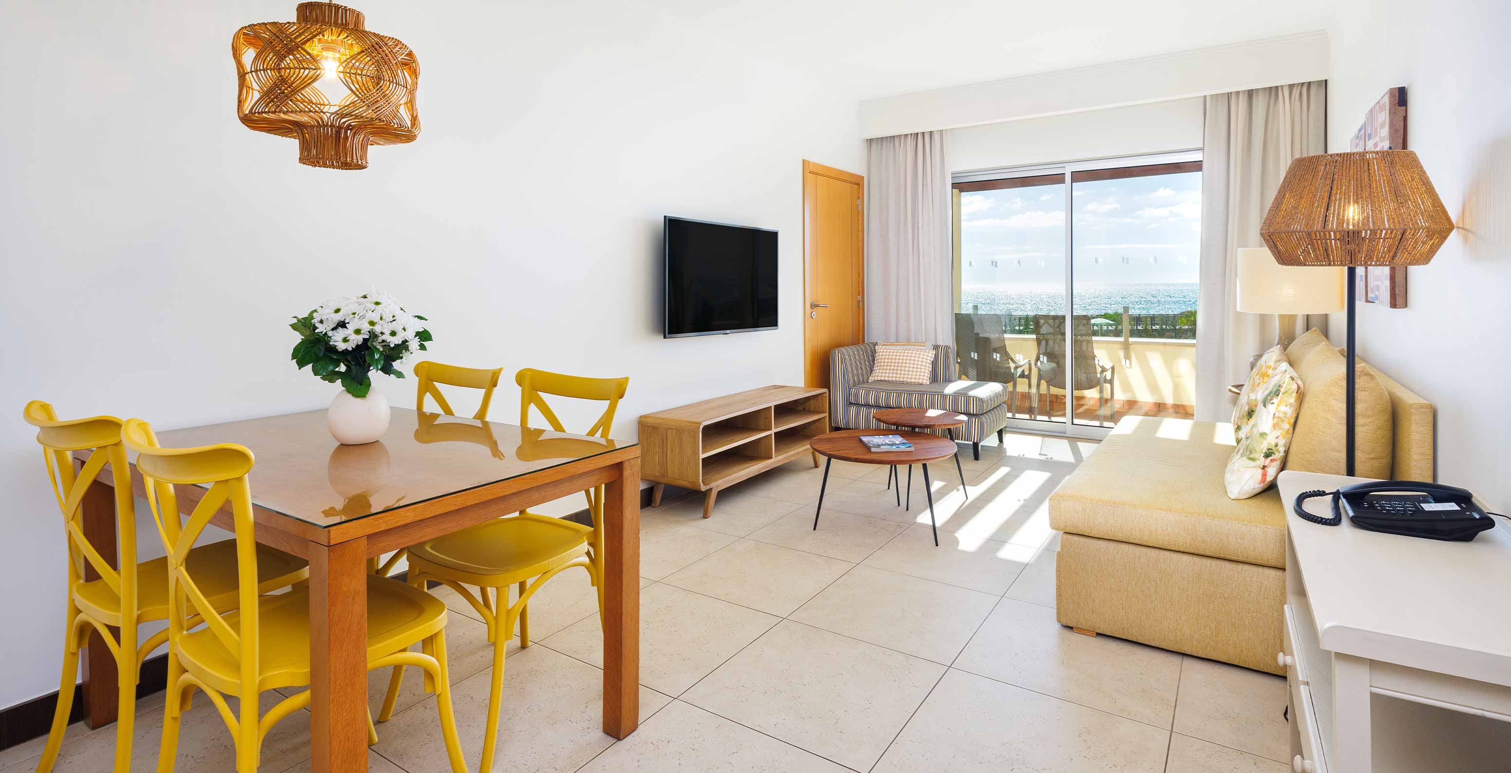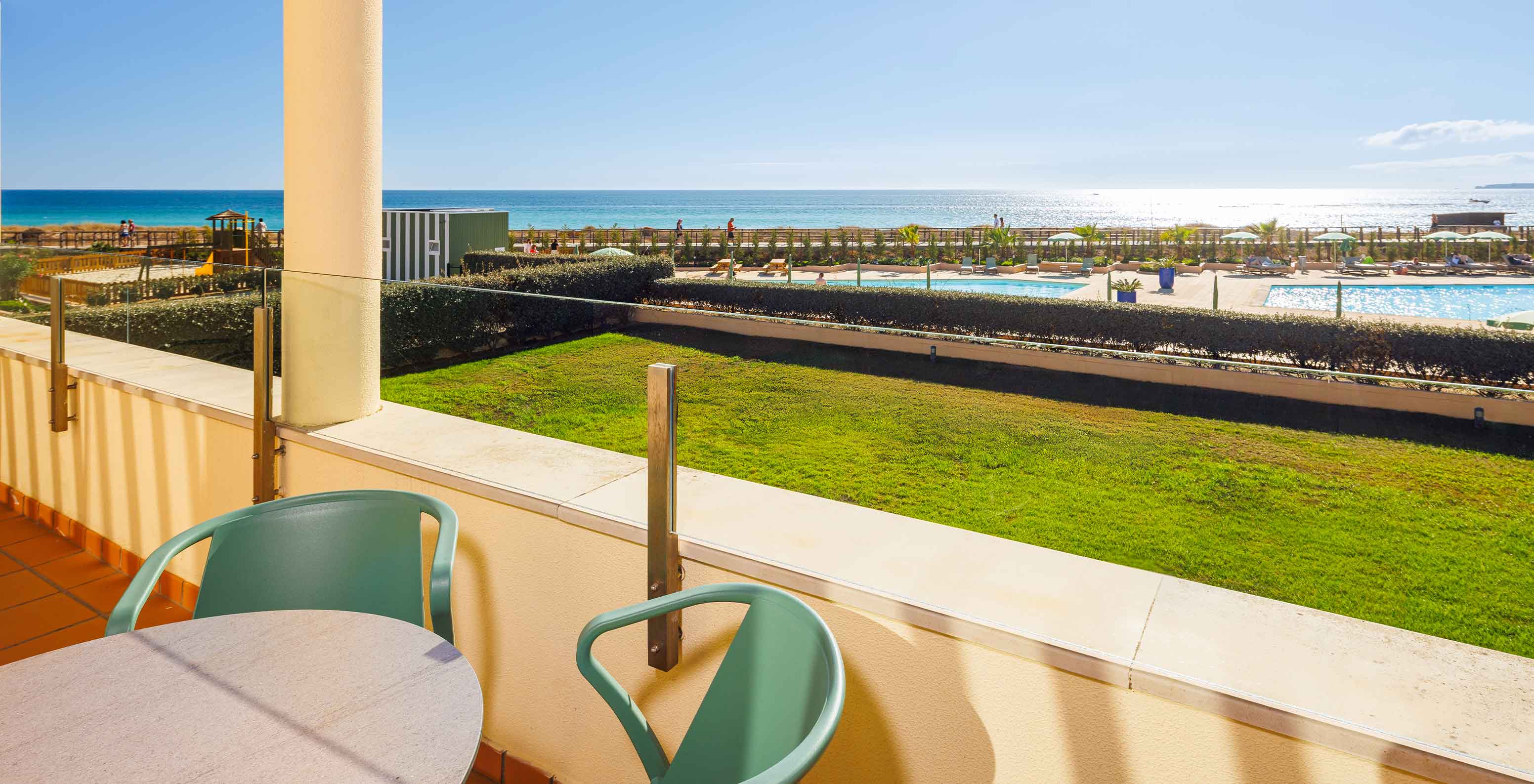 Family relaxes in their villa, enjoying sea and boardwalk views to Alvor Beach