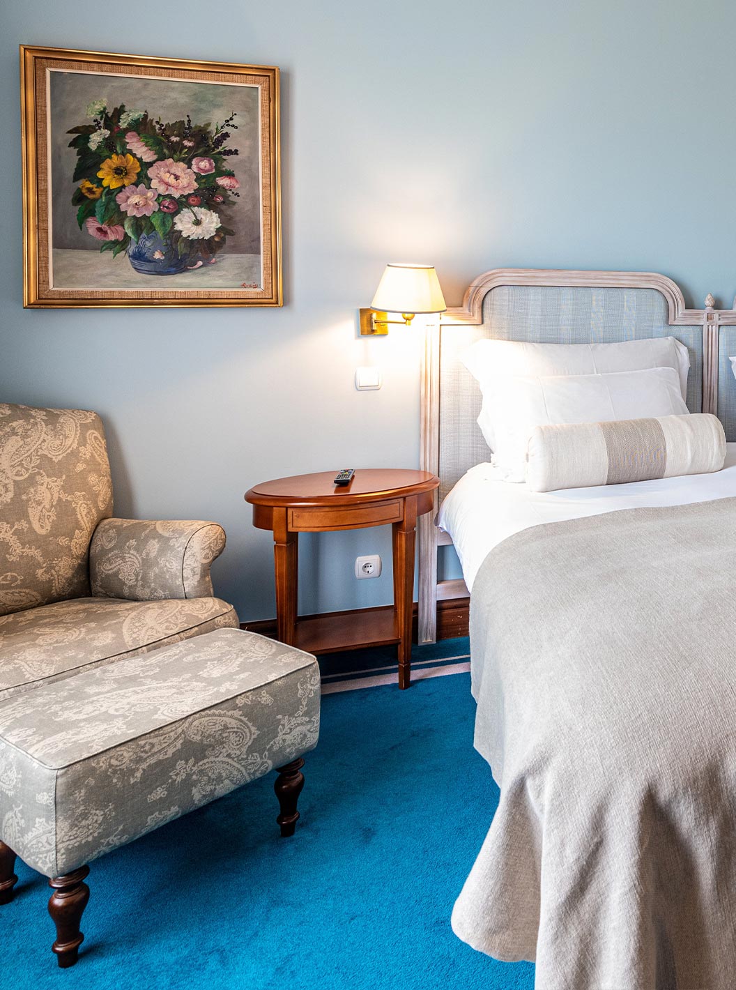 The Deluxe room at Pestana Palace Lisbon has two single beds, a window, an armchair, a desk, and a blue carpet