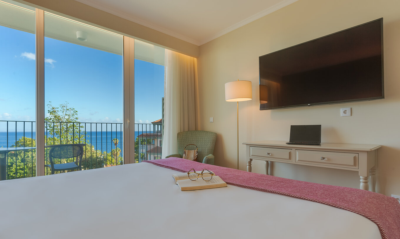 The Junior Suite Partial Sea View Room at Pestana Quinta Perestrello has a double bed, a sofa, and a television.